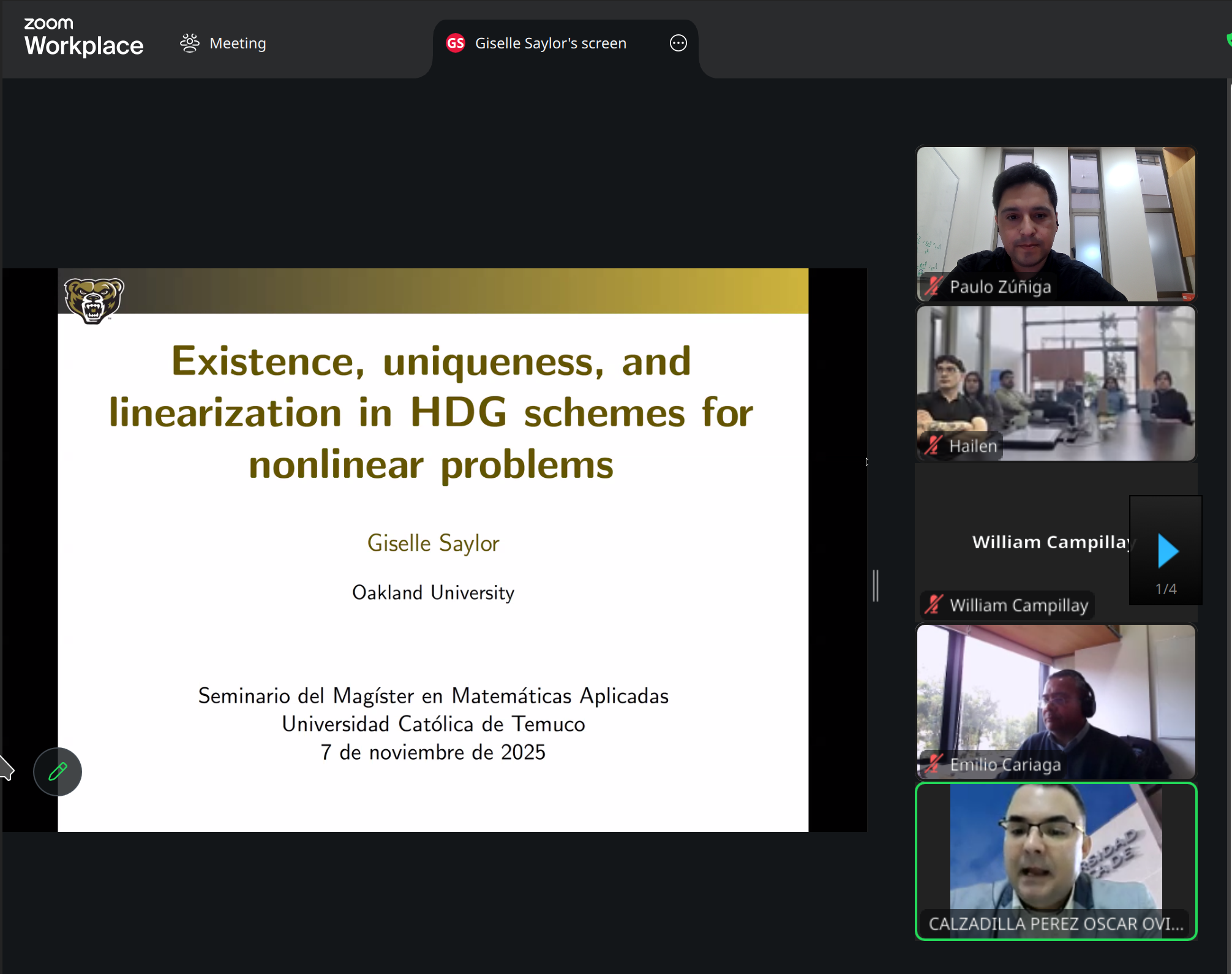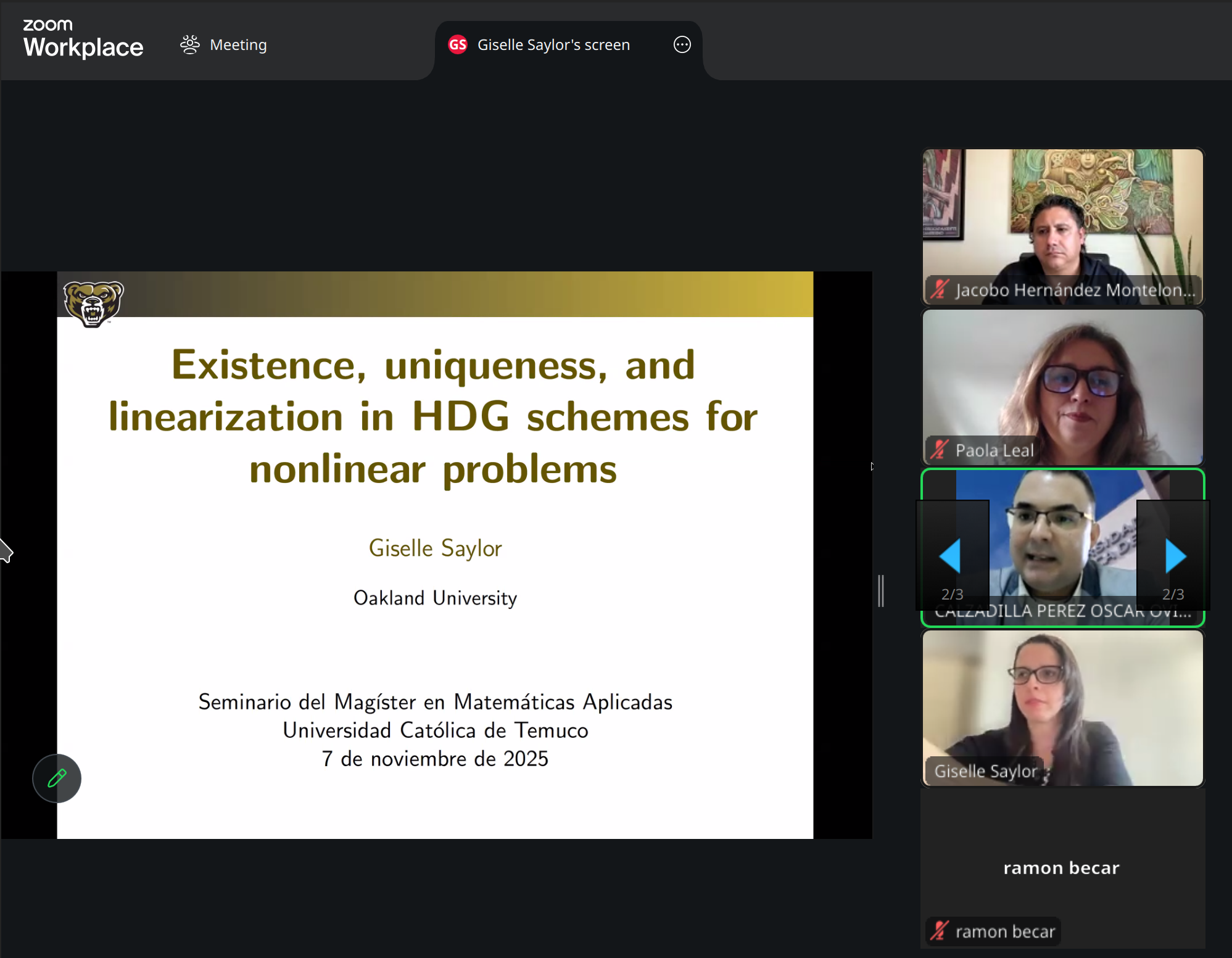 El seminario estuvo a cargo de la Dra. Giselle Saylor (Sosa Jones), profesora asistente en la Oakland University (Estados Unidos), quien profundizó en el desarrollo de métodos numéricos eficientes para la resolución de ecuaciones diferenciales parciales y su aplicación en el estudio de la formación de cristales y los flujos multifásicos, con potencial uso en diversas áreas de la ingeniería.